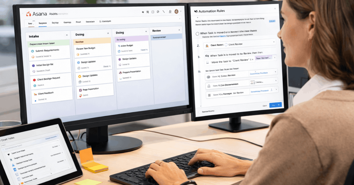 Asana supplies familiar list and board views, quick task assignment, and lightweight forms that funnel requests into a shared queue. Automation rules handle routine handoffs so manual updating does not swallow focus.