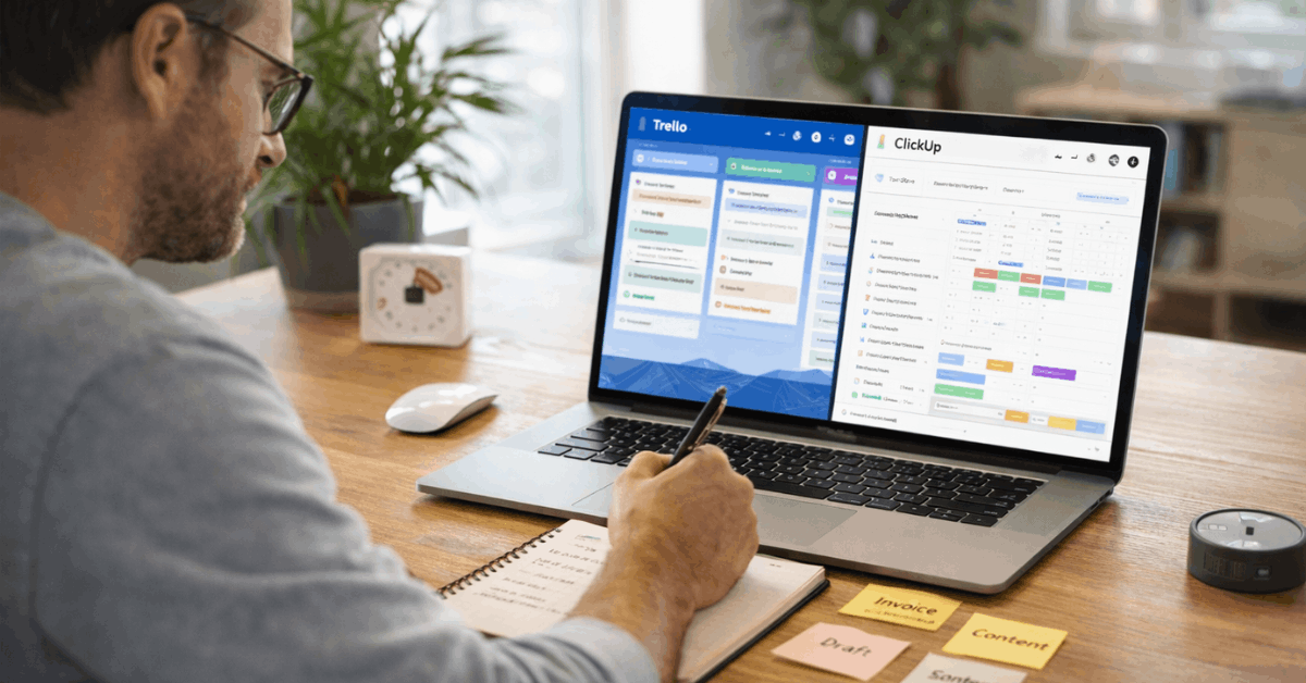 Trello vs ClickUp sits at the center of that problem for solo users who want a single, dependable hub. This guide focuses on one-person workflows, real setup effort, and how each platform handles capture, planning, and execution without team overhead.